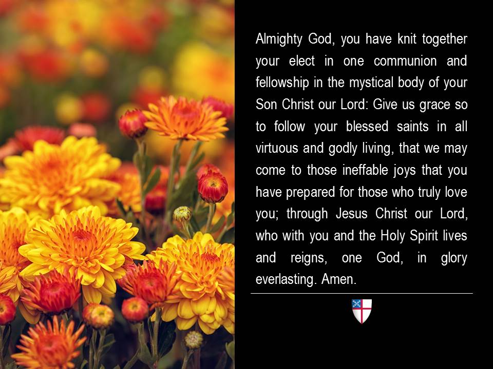 “All Saints' Day is the centerpiece of an autumn triduum. In the carnival celebrations of All Hallows' Eve our ancestors used the most powerful weapon in the human arsenal, the power of humor and ridicule, to confront the power of death. The following day, in the commemoration of All Saints, we gave witness to the victory of incarnate goodness embodied in the remarkable deeds and doers triumphing over the misanthropy of darkness and devils.” – The Rev. Sam Portaro from “Brightest and Best”Prayer: